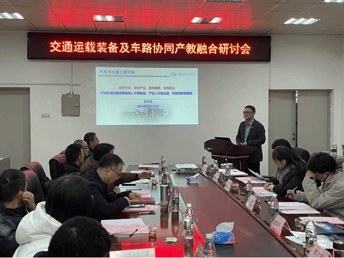 (汽车与交通工程学院 通讯员 刘祯)近日,学校汽车与交通工程学院、智慧交通研究院联合主办了交通运载装备及车路协同产教融合研讨会,东风汽车纳米科技(襄阳)有限公司、襄阳达安汽车检测中心有限公司、湖北物资流通技术研究所、湖北三环锻造有限公司等16家企事业单位相关负责人,汽车与交通工程学院、智慧交通研究院领导班子成员、教师代表参加会议。学校党委副书记、副校长张樊出席会议并致辞。