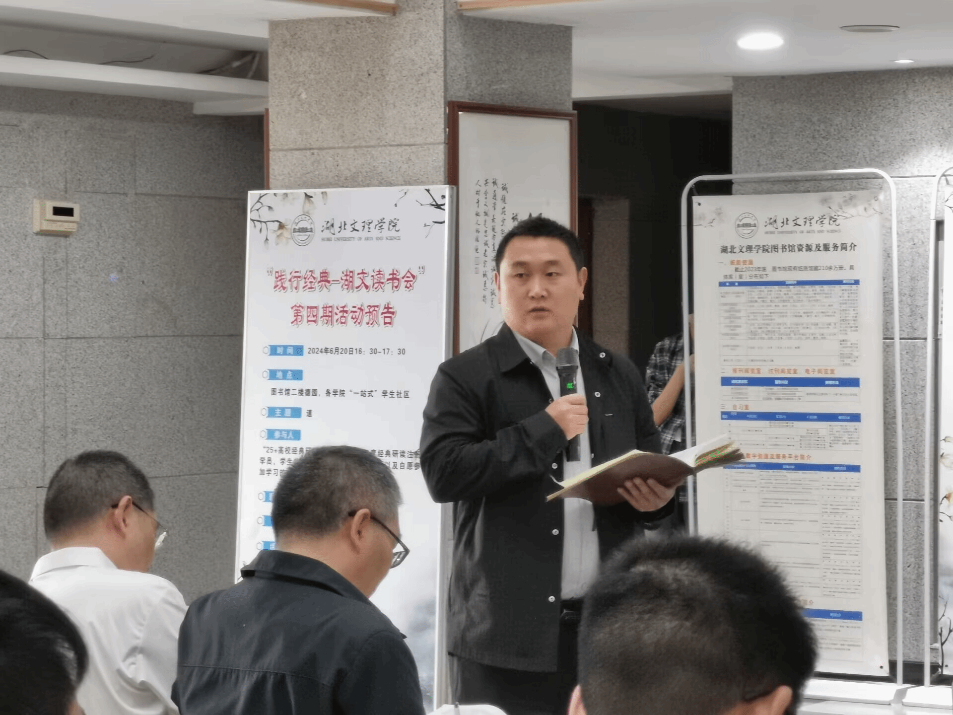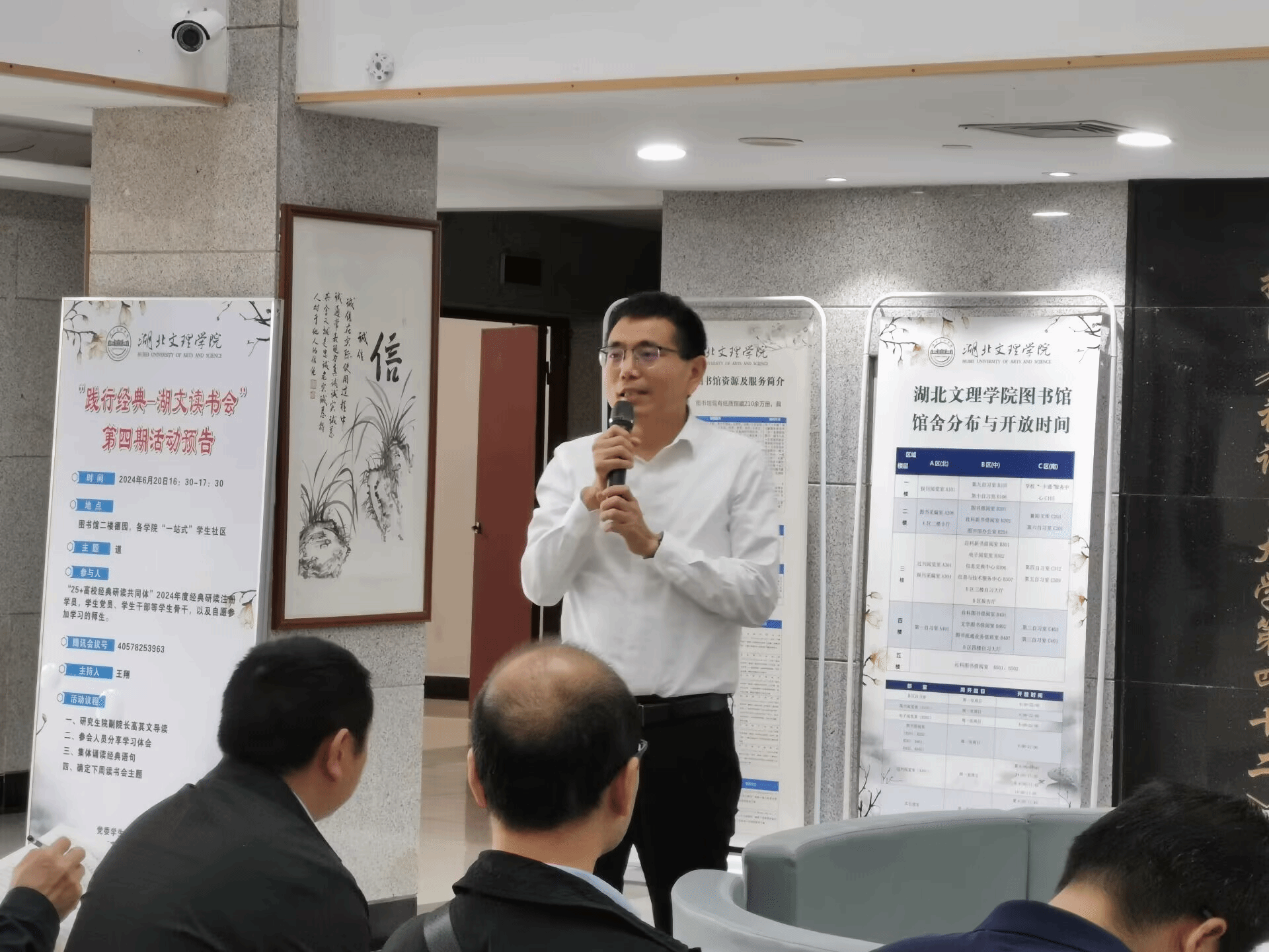 (襄阳历史文化研究院·汉江研究院 通讯员 瞿安全)4月24日下午,第三十三期“湖文读书会”在图书馆二楼德园举行,学校马克思主义学院副教授熊明秀以“礼”为主题作经典导读分享。学校党委书记吴超仲参加读书会。读书会由襄阳历史文化研究院·汉江研究院高慧霞博士主持。